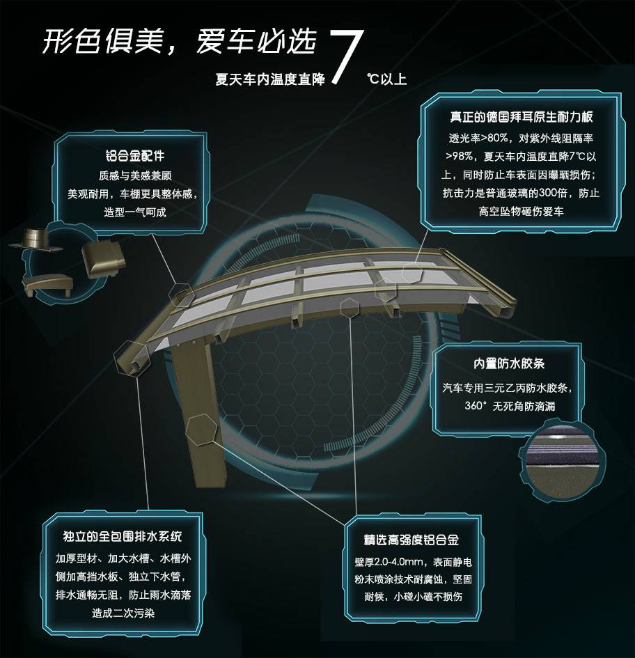 爱游戏体育官网首页-爱游戏(中国)车棚系列全部采用高品质、高强度铝合金材料精加工而成,具备的氧化保护能力,不生锈,表面特殊的工艺处理,大大提高了车棚的使用寿命。顶棚使用添加了防止紫外线涂层的德国拜耳耐力板,降低了来自紫外线的分解,历久弥新,成就了优越的耐候性。
